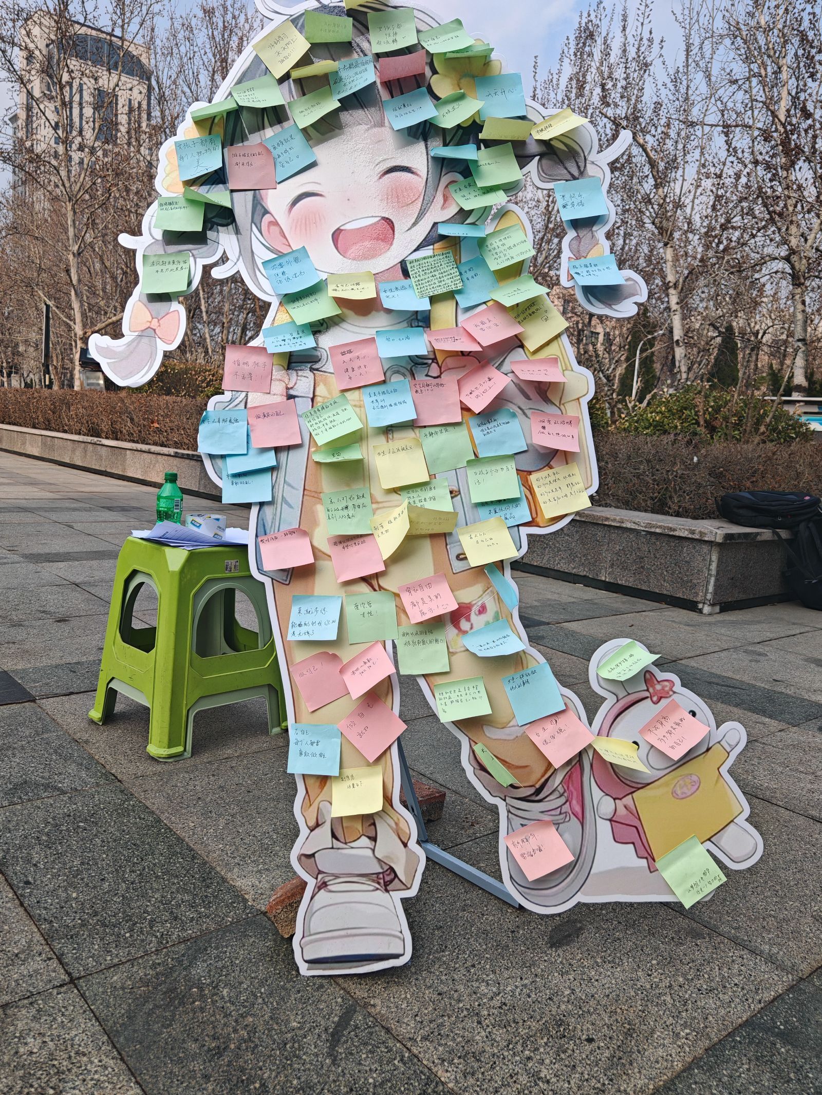 活动处有一面小女孩立牌,上面贴着普通人对于女生的刻板印象白色便利贴,参加活动的同学则需要撕下那些对女生的偏见,并在彩色便利贴上写下内心对于女生真挚的鼓励。活动现场场面热闹,同学们云集于此,纷纷用纸笔书写下内心的祝愿。