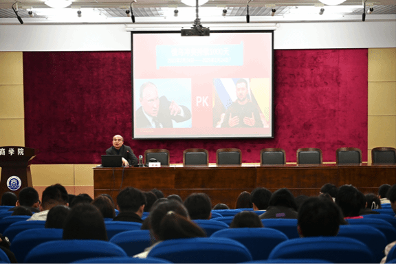 随后,梁栋作了题为《俄乌冲突对国际安全格局的影响》专题讲座。梁栋结合当前国际国内形势,深入浅出地阐述了马克思主义的基本原理,以及在新时代背景下青年学生如何更好地继承和发扬马克思主义精神。通过对比不同国家和地区的发展状况,使学生们认识到了中国在国际舞台上的重要地位和作用。梁栋用鲜活的言语向同学们传递青年马克思主义者的责任与使命,他指出,作为新时代的青年马克思主义者,不仅要深入学习马克思主义理论,不断提高自身的理论素养和实践能力,还要关注国际形势,理解国家战略,为实现中华民族伟大复兴的中国梦贡献青春力量。