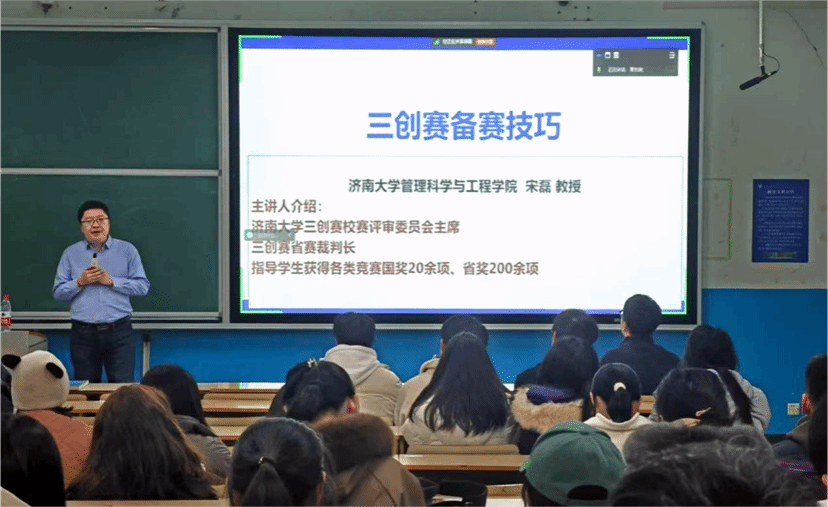 宣讲伊始,宋磊教授详细介绍了三创赛的备赛技巧,鼓励同学们要敢于突破传统思维,勇于创新,并从国家政策变化、社会结构改变、社会理念更迭、科学技术变革、学科创业领域、市场痛点要求以及个人兴趣爱好等多个方面,深入剖析了项目选题的方法和破题方向。他强调,一个好的项目选题应该紧跟时代潮流,符合市场需求,同时又能体现个人的专业、兴趣和特长。针对同学们在备赛过程中可能遇到的常见问题,如选题视野狭隘、题材过大、创新受经验和知识储备影响常常不足、对产品和市场不做调研、盈利模式不清晰、服务内容过多等,宋磊教授也给出了具体的解决建议,鼓励同学们要拓宽视野,敢于尝试,同时要注重市场调研和数据分析,确保项目的可行性和盈利性。