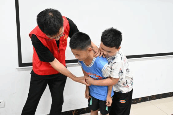当遇到小伙伴吃东西噎住时怎么办?成员们通过生动的情景剧表演,形象地展示了海姆立克急救法。针对向他人求救、自救等情况,成员们化繁为简,教孩子们最核心的“剪刀石头布”定位法(肚脐上两指,握拳冲击),并邀请小朋友上台扮演“小超人”,在保护下模拟练习,现场笑声和掌声不断,知识也深深印入脑海。